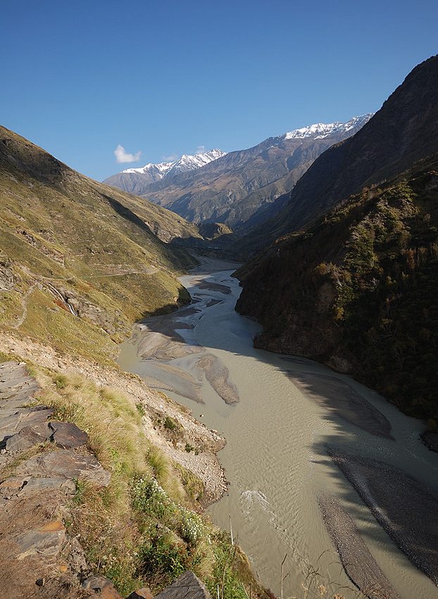 c. Ladakh is het district achter de hoge Himalaya passen. Dit “Little Tibet” ligt geheel in de andere wereld van de “Trans Himalaya”. Het verdient wat extra aandacht omdat dit het doel is van de meeste van onze India reizen. Ladakh ligt ingeklemd tussen de Himalaya en Karakoram ketens, grenzend aan Pakistan en Chinees Turkestan (Sinkiang) en de “autonome” Chinese provincie Tibet. Het gebied wordt doorsneden door vele grote rivieren, zonder uitzondering toevoer-stromen van de Indus. De Indus is de langste rivier, die ontspringt in west Tibet en parallel aan de grote bergketens van zuidoost naar noordwest door Ladakh stroomt, om in Pakistan zuidwaarts naar de Indische oceaan af te buigen.