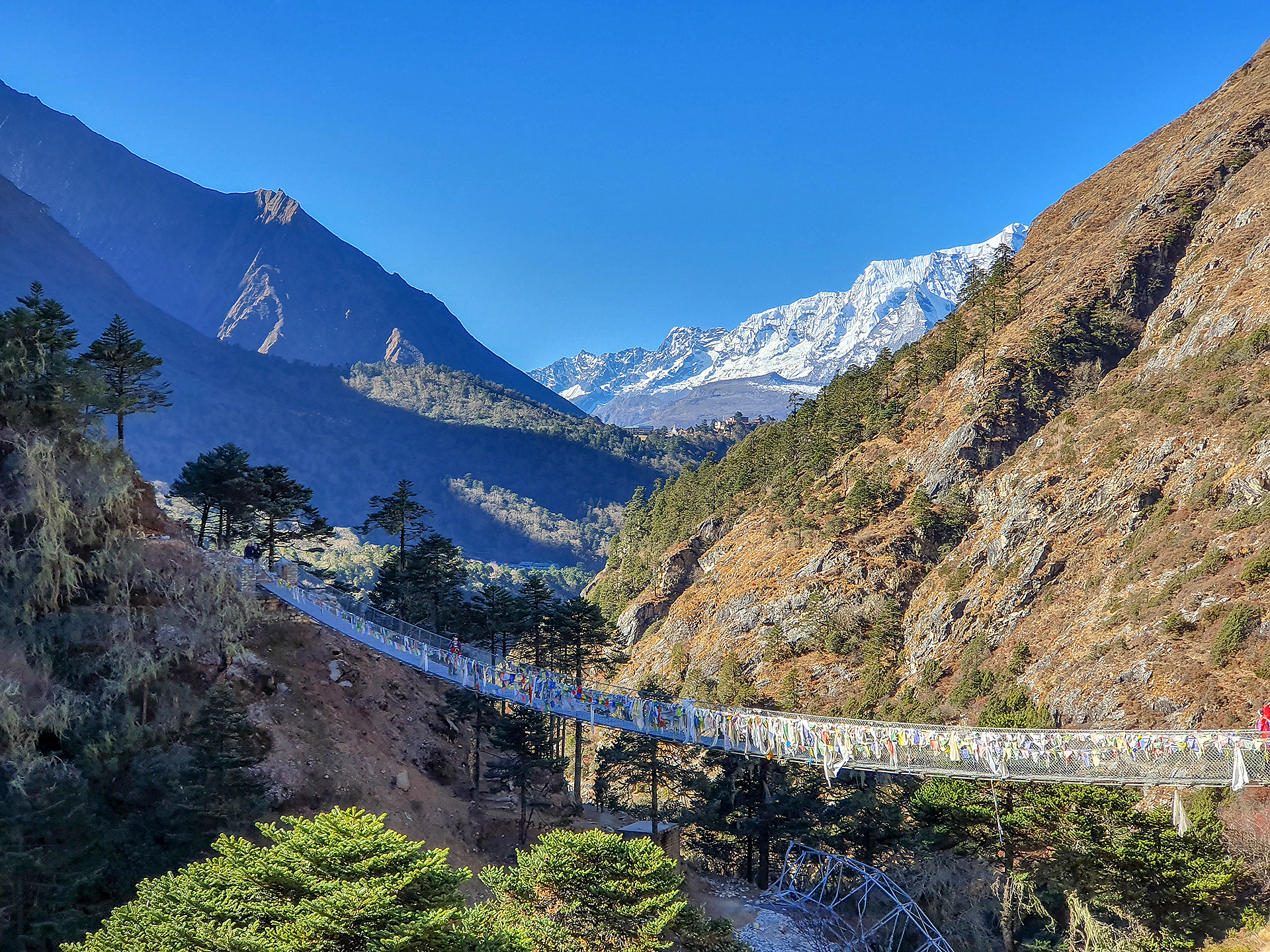 Het pad naar het ‘Dak van de Wereld’ begint met een afdaling naar de Dudh Kosi (= Melkrivier). Onderweg passeren we (het liefst linksom om een goed sonam af te dwingen!) gebedsmolens, gebedsmuren en rotsblokken die kleurig versierd zijn met spreuken en gebedsvlaggen. We overnachten in Phakding, met zijn eerste lange hangbrug over de rivier. (3 uur, 2650m)
