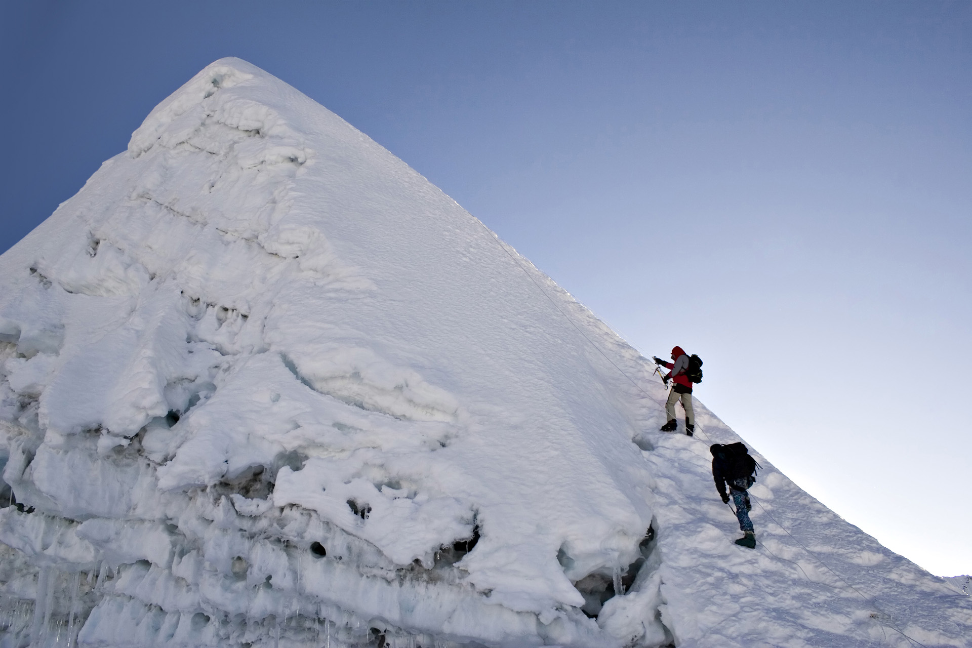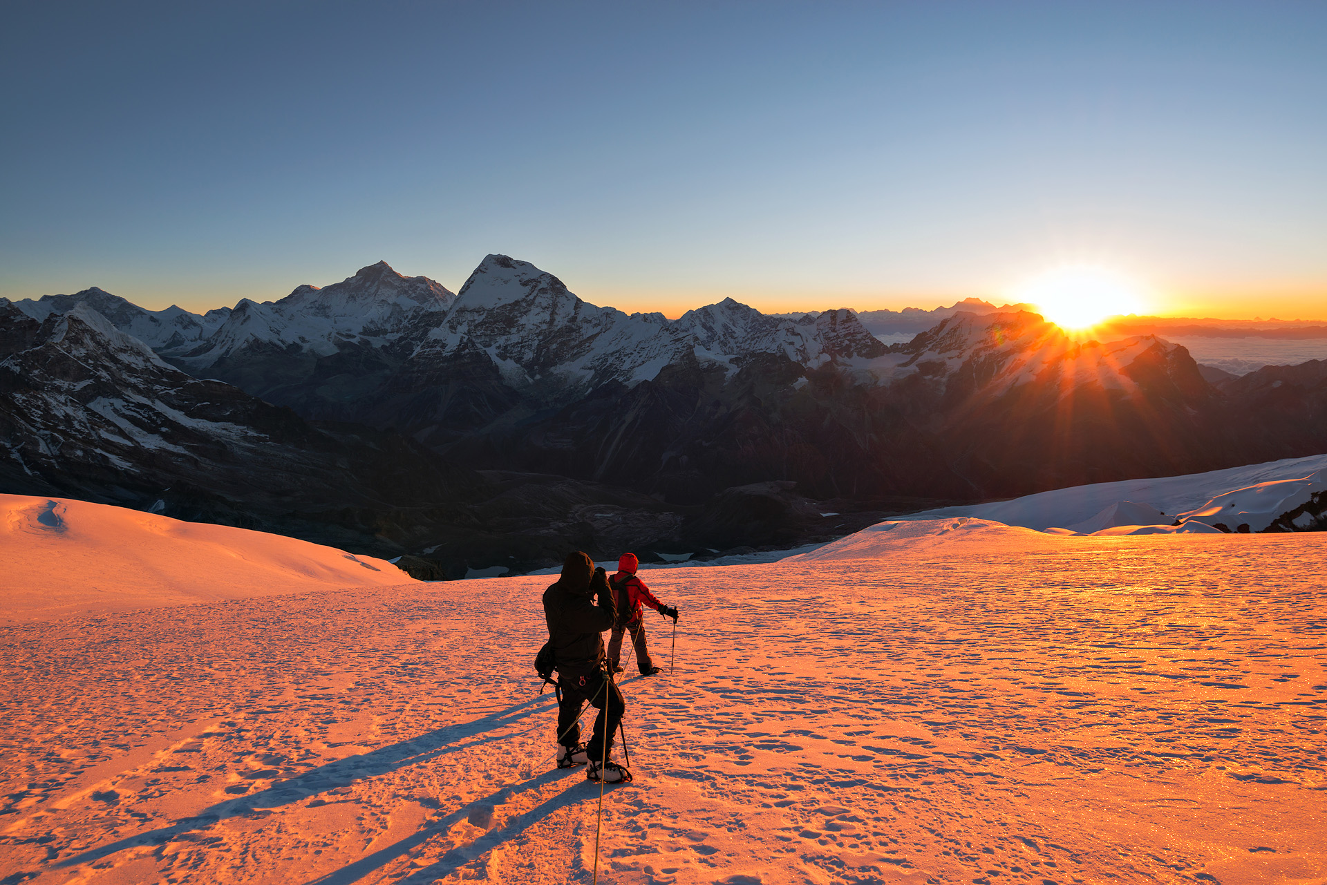 De Mera Peak is met z’n hoogte van 6461m de hoogste ’trekking peak’ en de Amphu Labtsa geldt als een van de uitdagendste pasovergangen van Nepal. Island Peak (6189m), met z’n adembenemende uitzicht op de Lhotse zuidwand, is de uitsmijter van deze zware alpiene mini-expeditie.