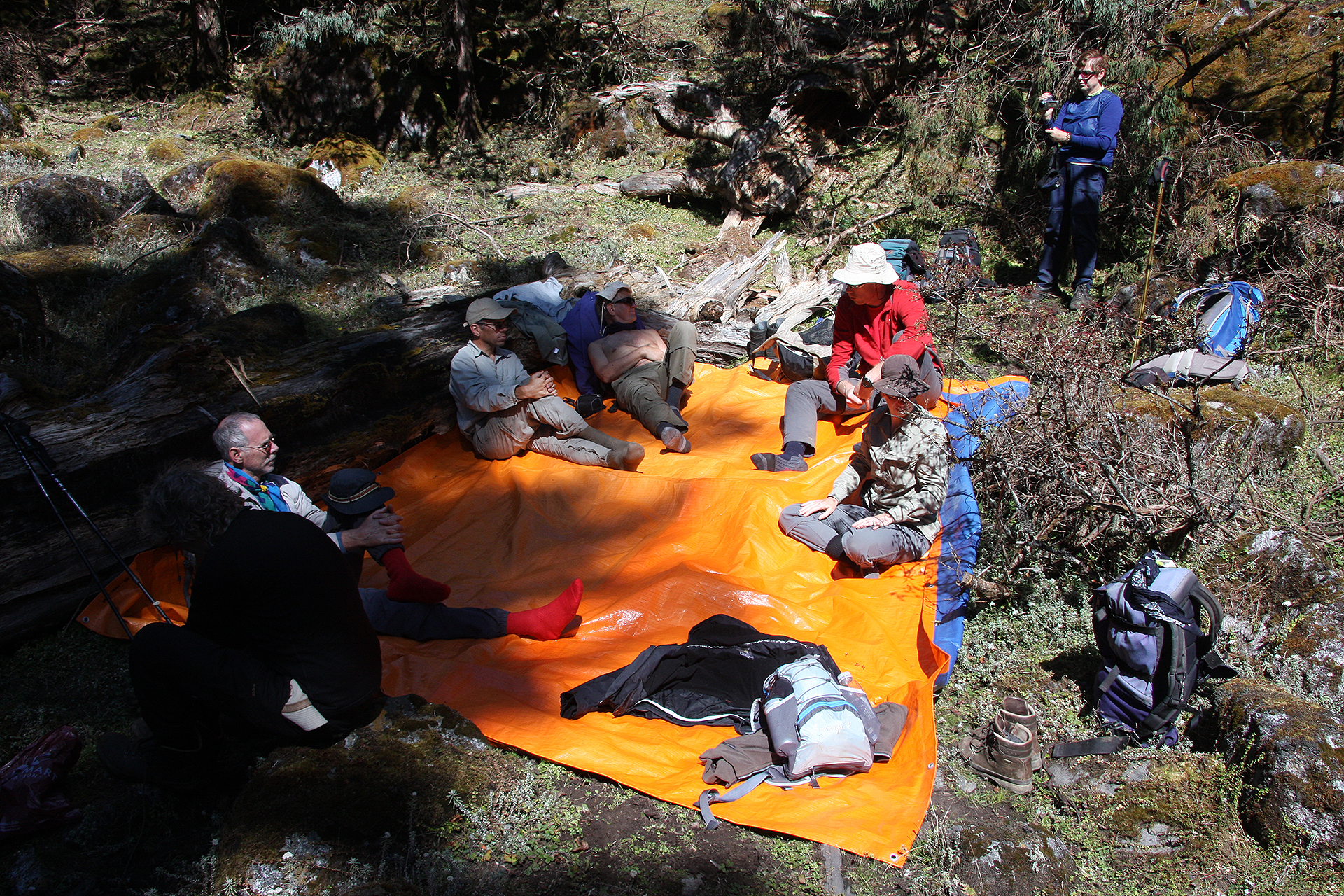 De bewoonde wereld ligt nu definitief achter ons. We dalen nog wat verder af naar de rivier en dan gaan we verder door de sprookjesachtige wereld van oerbos, beken, watervalletjes en een weelde aan planten en bomen. Baardmossen en met klimop omwoekerde bomen, struiken, bloemen en in het voorjaar bloeiende rodondendrons. Met dik mos beklede grote en kleine rotsblokken waar het bospad zich langs en over slingert. Hier en daar de littekens van recente landslides maar dat is een natuurlijk proces van afsterven en wedergeboorte, evenals de omgevallen bomen die soms deels over het pad liggen en waar we dan omheen of overheen moeten. Een zichzelf regulerende puur natuurlijke wereld. We volgen de Likhu Khola omhoog naar zijn oorsprong, de Likhu gletsjer. Het gaat gestaag omhoog door de jungle en soms is het pad niet helemaal duidelijk, totdat we rond 3700 m het bos uit komen en de met struiken begroeide hellingen naar onze campsite voor de komende twee dagen volgen. Een primitieve brug over de Likhu Khola geeft toegang tot een idyllische ruime campsite omringd door bomen en met wat houten hutjes die gebruikt worden door herders als ze hier hun kudden laten grazen.