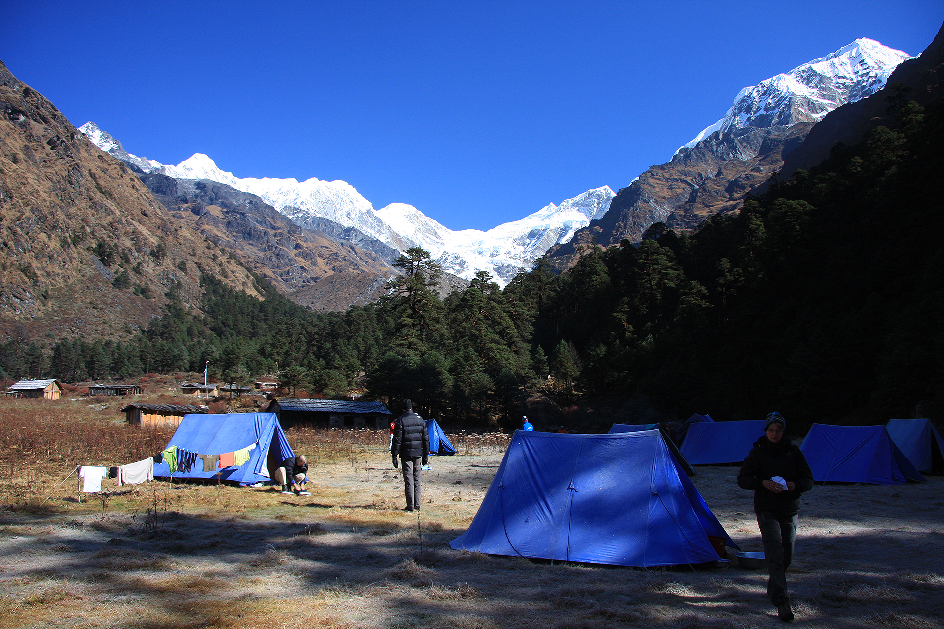 Vanuit het kamp meteen omhoog naar +/- 4300 m. Dan een spectaculaire trail langs de berghelling in de richting van de Panch Pokhari pas. Eenmaal boven (4600m) kijken we uit over één van de meren van Panch Pokhari. We nemen de tijd om van het uitzicht te genieten, voor we af gaan dalen naar de campsite aan de Chiwang Khola. Deze rivier ontspringt op de hellingen rond Panch Pokhari en stroomt via het meer naar het lager gelegen Jata Pokhari, om vandaar verder naar het zuiden in de Khimte Khola uit te komen. Overmorgen zullen we deze rivier oversteken vlak voor hij zich met de Khimte Khola verenigd. We dalen af door een brede kloof via een vrij steil pad dat soms besneeuwd kan zijn en lunchen bij het heilige Jata Pokhari. Hier zien we dat het meer soms bezocht wordt door pelgrims. Daarna volgen we de rivier min of meer tot we bij de campsite zijn. We zijn nog steeds boven de boomgrens maar zien beneden ons de dicht beboste hellingen van het dal.