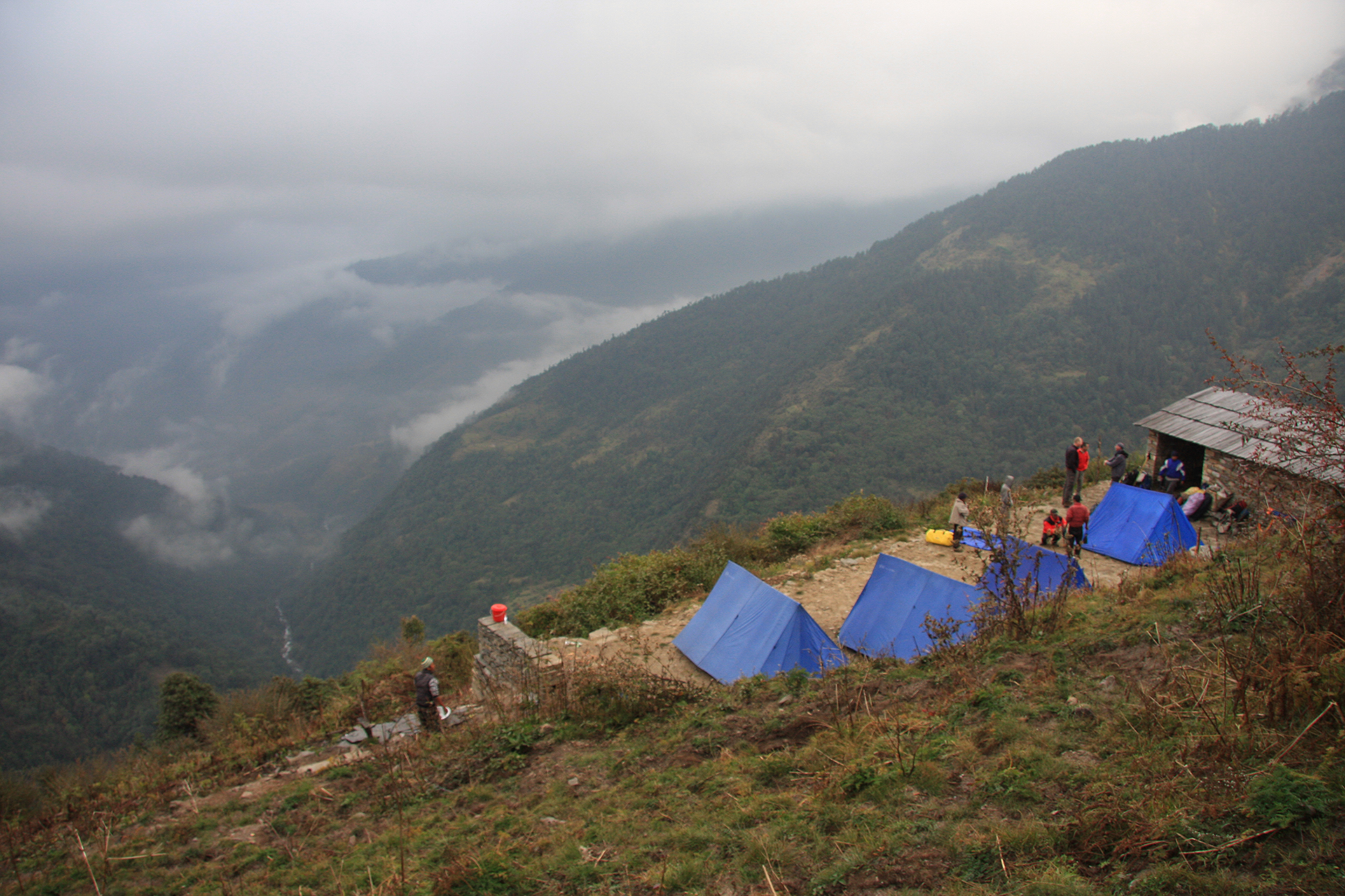 Vanaf de kampplaats volgen we de rivier nog even maar al vrij snel buigt het pad af doordat de rivier een vrij groot verval heeft en wij de berghelling blijven volgen. Het gaat licht op en neer (Nepali flat) tot we op de graat aankomen. Een open plek met wat vervallen hutjes en een goede kampeerplek maar er is geen water. We volgen het pad over de hier en daar beboste graat tot gebedsvlaggen het eind aangeven en we de afdaling naar onze volgende campsite inzetten. Door prachtig oerbos slingert het pad zich omlaag naar Phani Pakhpa. Een niet al te grote open plek met een paar hutjes waarin de keukenploeg zich zal nestelen om de beperkte ruimte te kunnen benutten voor onze tenten, de porter tent en de dining tent. Vanaf deze plek kijken we uit over de vallei van de Khimte Khola en kunnen we ons eindpunt Shivalaya al zien liggen.