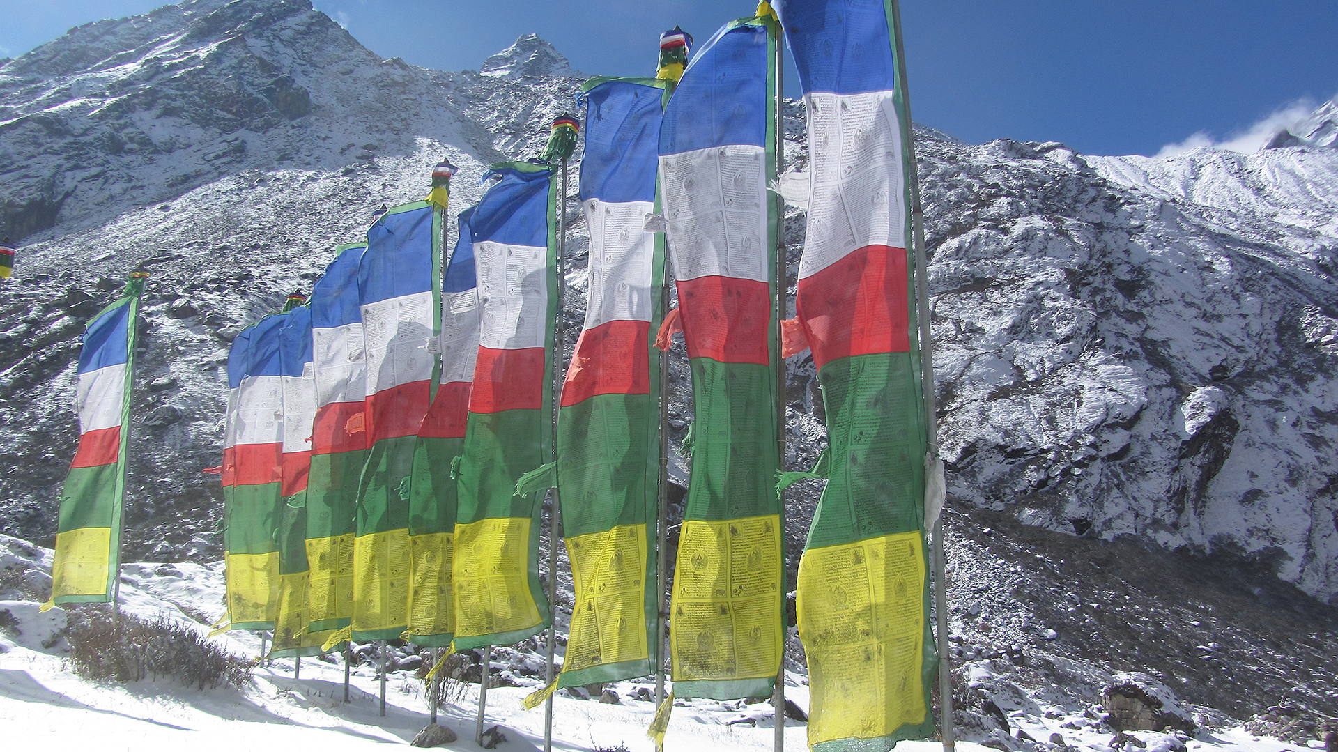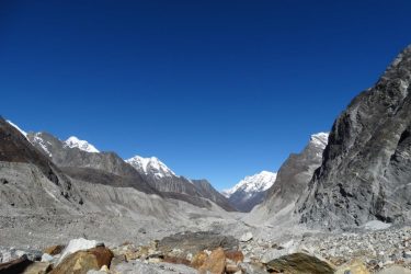 Het is nog slechts een vlakke wandeling met hier en daar een korte stijging naar het gletsjerkamp recht onder de Tashi Labtsa, Parchamo en de imposante ‘muur’ van Tengi Ragi Tau. Een verdere rondblik reikt tot alle hoge bergtoppen rondom de Drolambau-gletsjer en tot de bergen op de grens van Nepal met Tibet! (5 uur, 5350m)