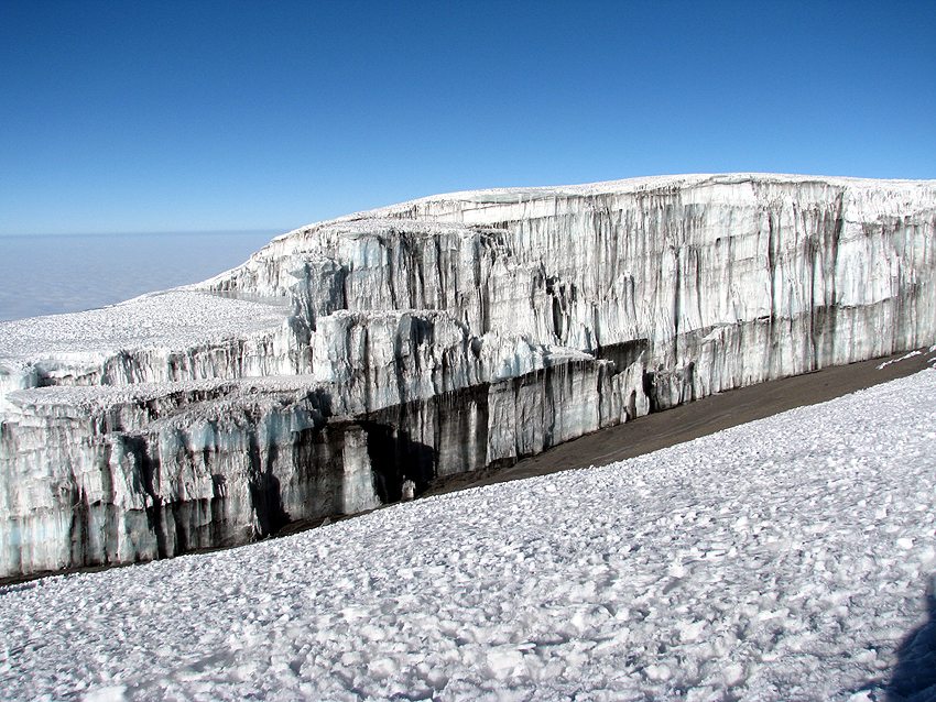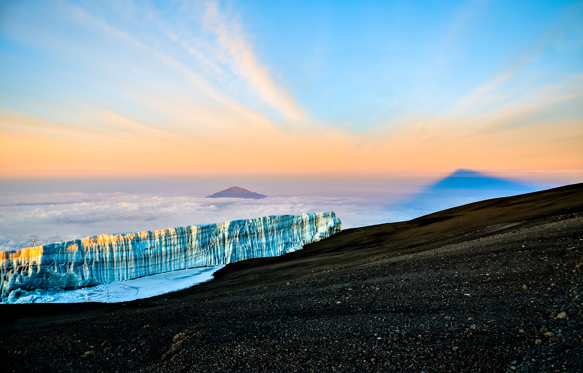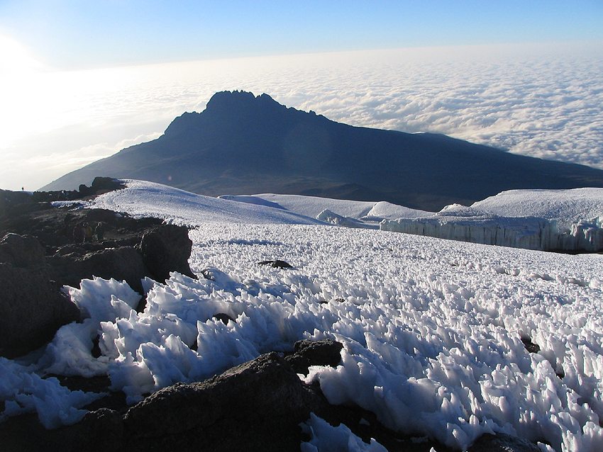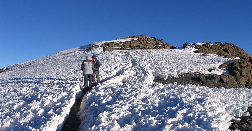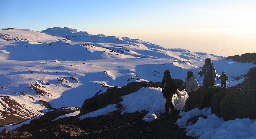 De klim wordt iets steiler naarmate we Gilman’s point (5681 m) bereiken, we komen hier ongeveer 5-6 uur aan na het vertrek uit School Hut. Neem een moment de tijd om bij het eerste daglicht te genieten van het prachtige uitzicht richting de Mawenzi Peaks.