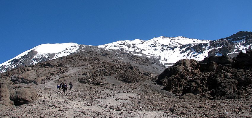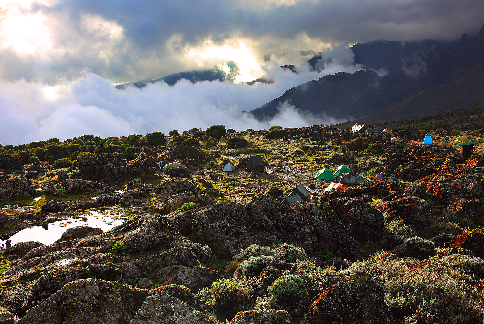 Vandaag klimmen we verder richting oosten door de ‘Garden of the Senecios’  en bereiken de alpiene zone. In de ochtend klimmen we langzaam maar gestaag naar de Lava Tower en de Shark’s Tooth rotsformatie. Op 4500 m lunchen we met prachtig vergezicht op het laagland (als de wolken het toelaten). Na de lunch dalen we af naar Moir Camp. Deze dag is een prima dag voor de hoogteaanpassing. Het lopen naar een hoogte van 4500 meter en vervolgens weer afdalen naar de kampplek een paar honderd meter lager is goed voor het acclimatisatieproces en als het goed is hebben we daar de rest van de beklimming profijt van.
