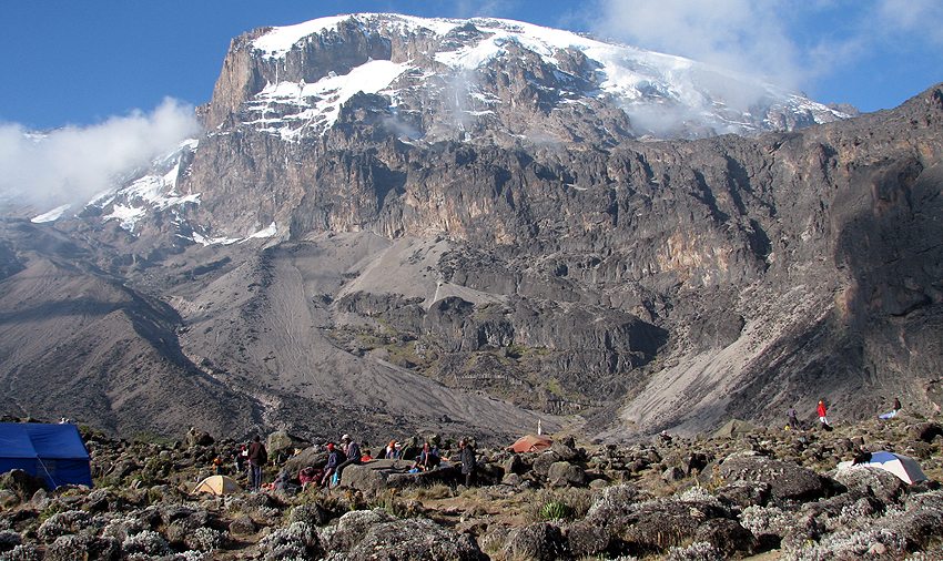 Doordat er op het Barafu kamp (4600m) geen water aanwezig is lopen we vandaag in 3 tot 4 uur over de flanken van de Kilimanjaro naar Karanga, de laatste water tap plaats.