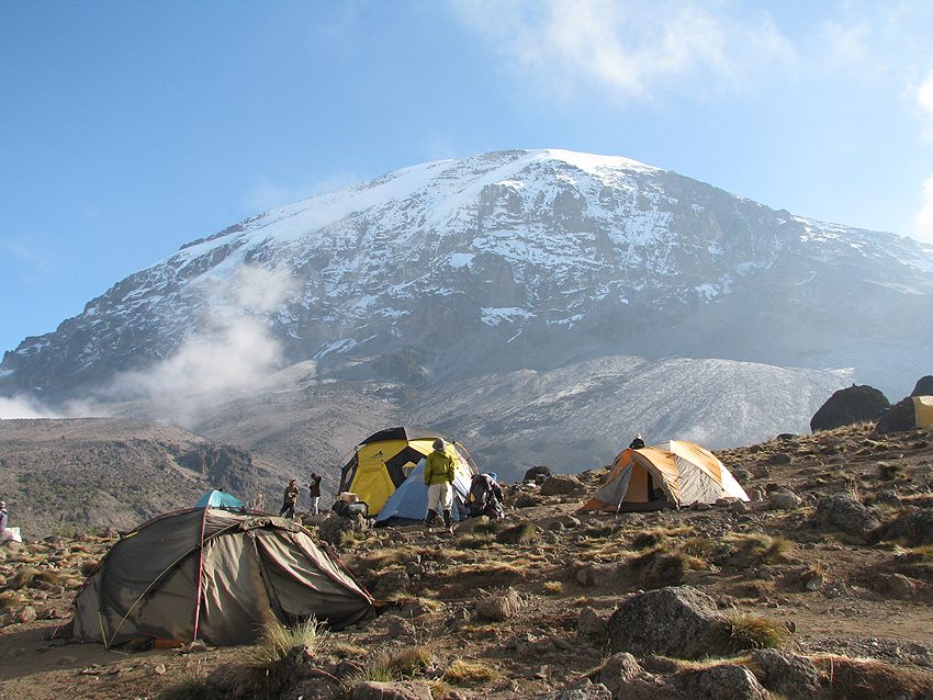 De afdaling is lastig, wegzakkend in de kiezelstenen moet je je naar beneden laten glijden. Nu krijg je een goede indruk, wat je de afgelopen nacht gestegen en gepresteerd hebt. Mooi uitzicht op de Kibo hut in het zadel tussen de Mawenzi en de Kraterrand. Na een uur of drie ben je terug bij de tenten waar je na een uurtje rust wat soep krijgt. Hierna is het tijd om de tent op te ruimen en de spullen in te pakken. Rond 12.00 uur gaan we verder naar beneden.