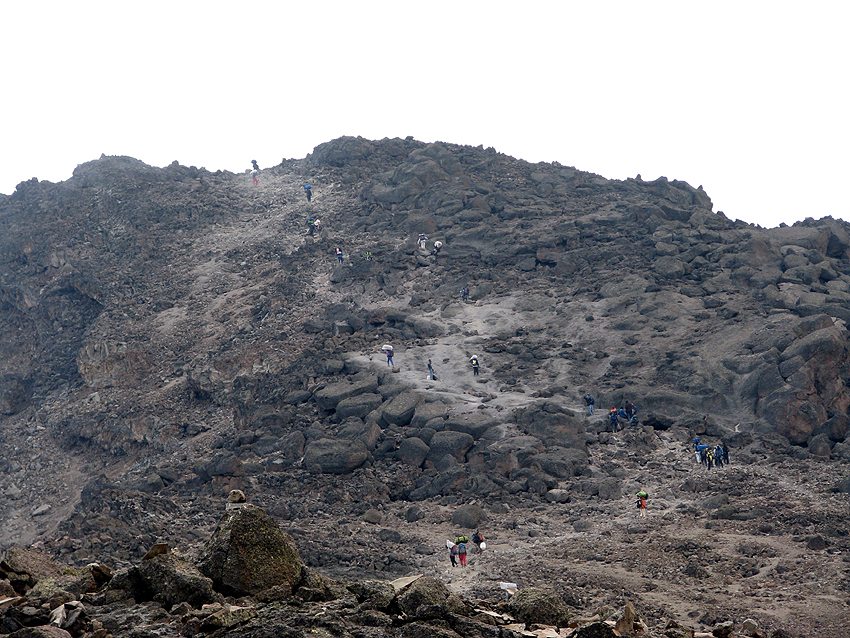 Nu zien we veel dragers als waterdragers richting Barafu kamp en Barafu high (4800m) Camp lopen.