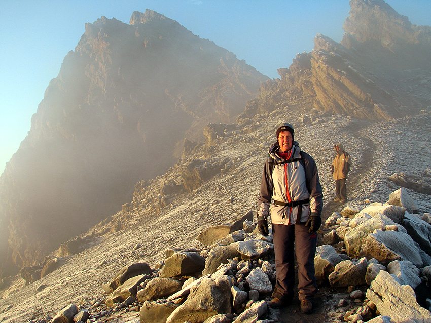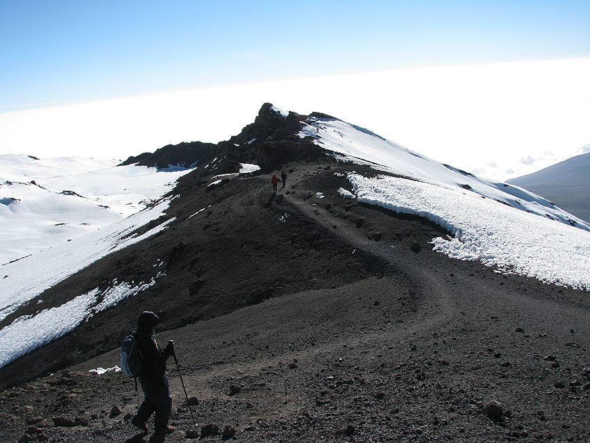 De meeste dragers blijven in onze tenten achter, en samen met een aantal gidsen slepen we ons voetje voor voetje (pole pole) vooruit. Na enkele uren beginnen we aan het zwaarste stuk: de klim tot aan de kraterrand. Dit is vooral lastig omdat de bodem bestaat uit zand met losse kiezelsteentjes waarin je voortdurend wegschuift. Uitgeput sta je dan tegen 6.15 uur, net op tijd om de indrukwekkende zonsopgang te bewonderen, boven aan Stella Point (5745 m.), waar je een prachtig zicht hebt op de Rebman Glacier, de Kersten Glacier en de krater en de Mawenzi Peak. Later ook op de Mt. Meru..