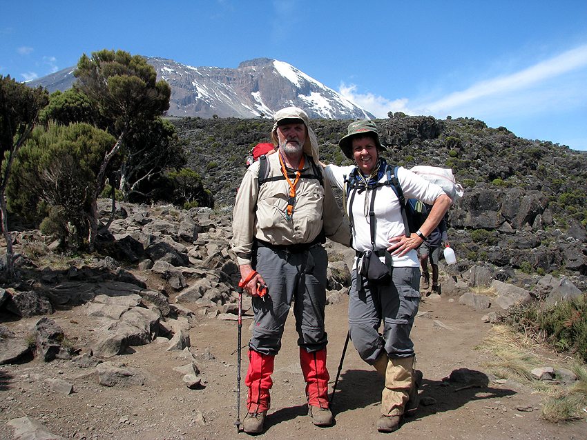 Bij het ontwaken was het nog tamelijk fris (zo’n 5°C), maar in de loop van de dag wordt het aangenaam warm en zonnig (19°C). Rond half negen beginnen we aan onze tocht, eerst door heide, later door een meer schaars begroeid landschap waarbij we de eerste heidebomen ontdekken. Afhankelijk van de tijd van het jaar, staan hier diverse bloemen in bloei. De Kameleon is zelfs te spotten. Op mooie uitzichtsrotsen kan het indrukwekkende landschap met daarachter de Kilimanjaro bekeken worden. Na 6 uur wandelen bereikten we de Shira campsite op 3840 meter hoogte, waar we een prachtig zicht hebben op de Kibo peak. Die Kibo Peak, met als top Uhuru Peak (5895m), is de hoogste van de 3 kraters van de Kilimanjaro (de twee andere kraters zijn Shira Plateau (3840m) waar we ons op dat moment bevinden en Mawenzi Peak (5149m)). Doordat het na zonsondergang zeer snel kouder wordt, kropen we al voor 20.00 uur in onze slaapzak.