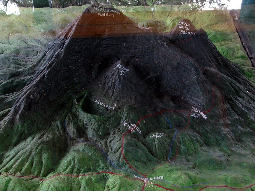 Na de lunch gaan we verder door het bos totdat we aankomen bij de Miriakamba Hut. In de middag hebben we ruim de tijd om de Meru-krater te verkennen. De 1500m hoge klif rijzende naar Meru Peak overschaduwt de krater. De 3667 meter hoge aspilaar in de krater bevindt zich een uur van de Mariakamba Hut en kan alleen worden beklommen met speciale vergunning.