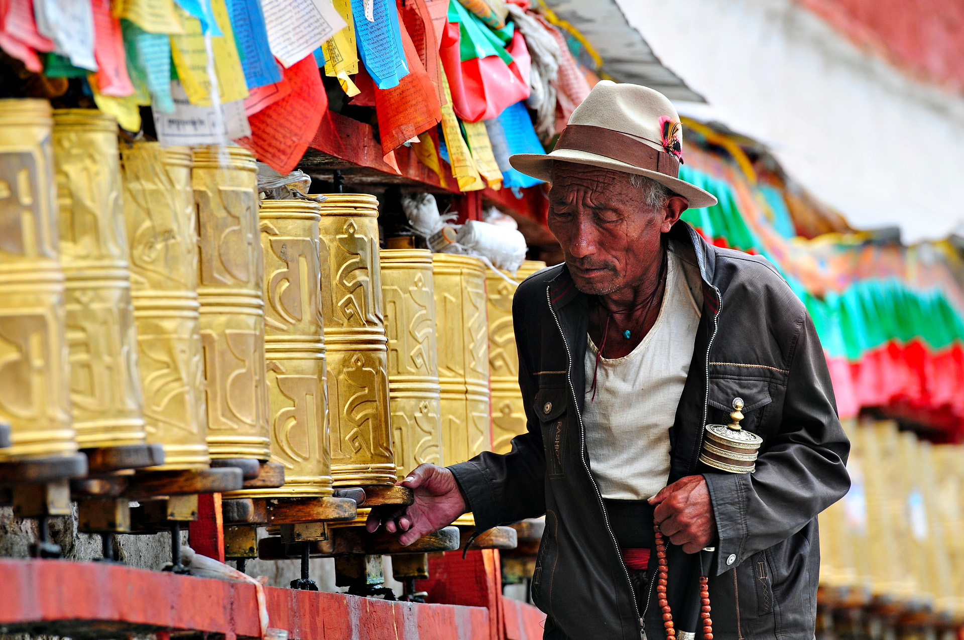 De Jokhang tempel is 1300 jaar geleden gebouwd op last van koning Songtsen Gampo en wordt dagelijks bezocht door vele pelgrims. Deze tempel met zijn gouden daken en het gouden boeddhabeeld van Jowo Sakyamuni is de heiligste plek van Tibet. Stilletjes sluiten we ons bij de schuifelende pelgrims aan, die zich ook regelmatig in het stof van de Barkhor Bazar werpen.